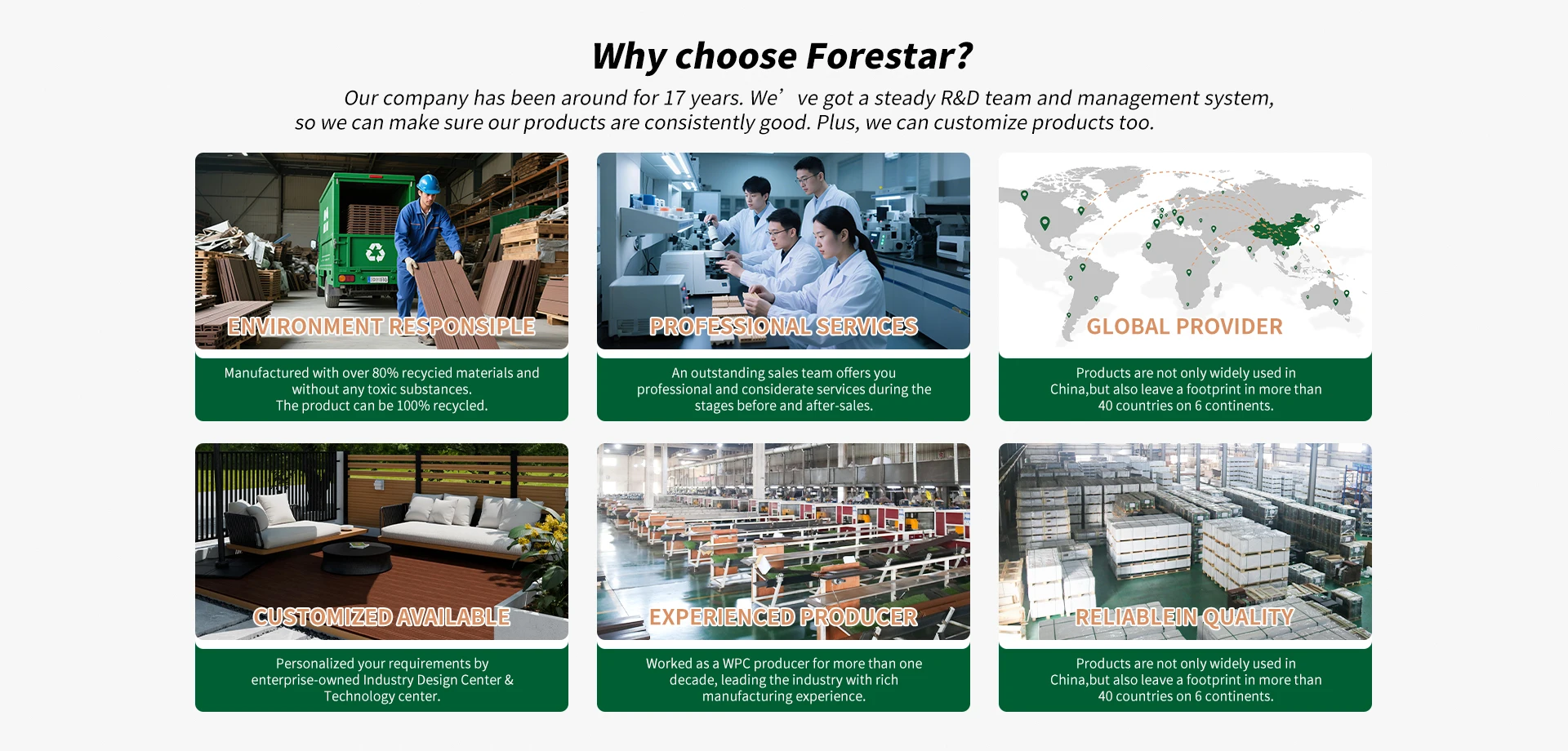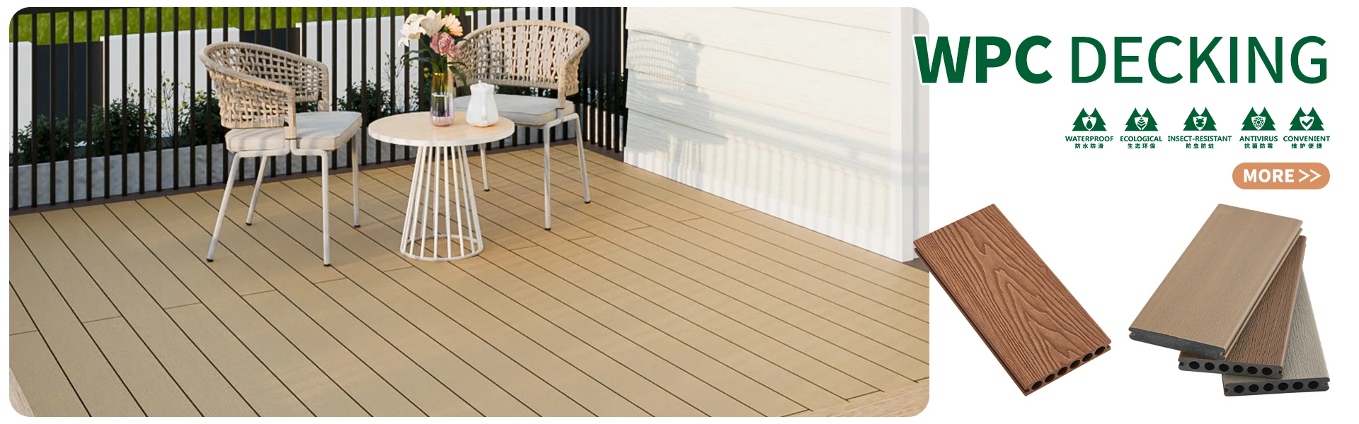 Productos principales:Cubierta de WPC, cercado de WPC, revestimiento de WPC, azulejos de bricolaje de WPC, cobertizos de jardรญn de WPC
